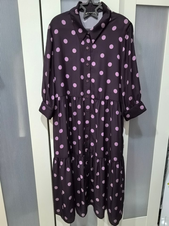 Severek giydim. Astarsızdır. İçine seyyar astar giymek gerekir. Birkaç yerinde ip çekmesi var, kullanıma engel değildir. Boydan düğmeli. Kolu hafif fakir koldur. Zemini patlıcan moru, puantiyeleri lila renktir.