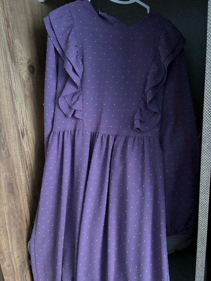 Mor puantiyeli, uzun kollu, V yakalı ve volan detaylı midi hamile elbisesi. Rahat ve şık, günlük kullanım için uygun.36 diyor ama ben 38 ken giydim