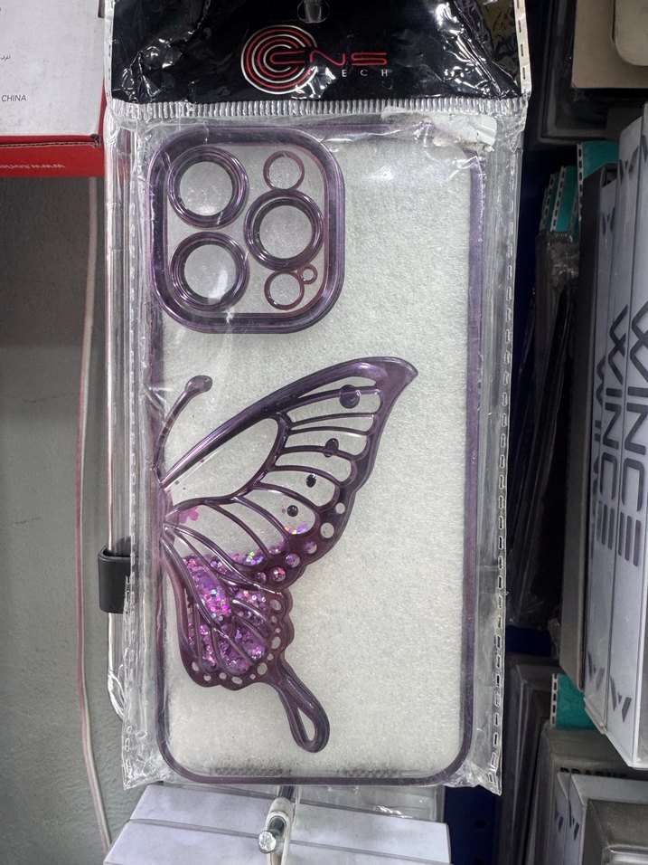 Koyu mor renkte, pullu kelebek tasarımlı bohem tarzda telefon kılıfı.