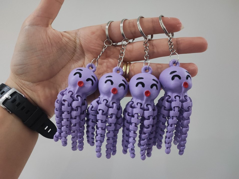 Mor renkli, püsküllü ahtapot figürlü anahtarlıklar. Her biri kolay takılabilen gümüş halka ile donatılmıştır.