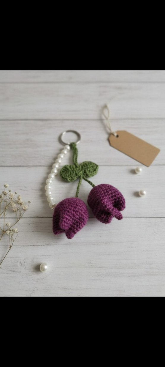 Mor püsküllü çiçekler ve yeşil yapraklardan oluşan bohem tarzı anahtarlık, beyaz boncuklarla süslenmiştir. Renkli ve rahat bir görünüm sağlar.