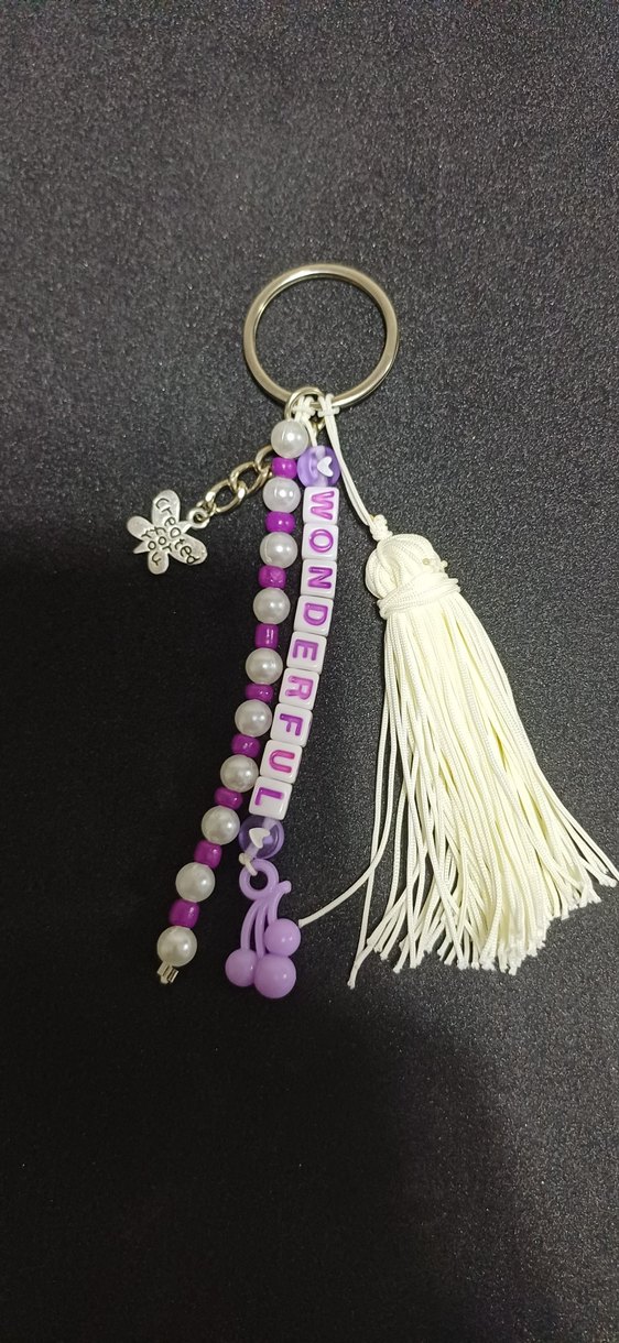 Mor renkli, beyaz püsküllü ve boncuklu bohem anahtarlık. Kelebek figürü ile renkli ve retro tarzı yansıtır. Farklı renkleri mevcuttur mesaj da belirtin satın alınız