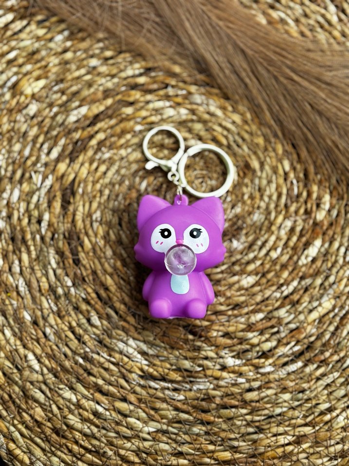 Mor renkli, bohem tarzda kadın anahtarlık, sevimli kedi figürü ve renkli püskül detayına sahiptir. Rahat ve retro bir hava katar.