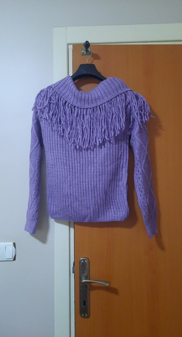 Mor renkli, uzun kollu, yuvarlak yakalı ve püsküllü detaylı bohem tarzda kısa ve fitted kazak.