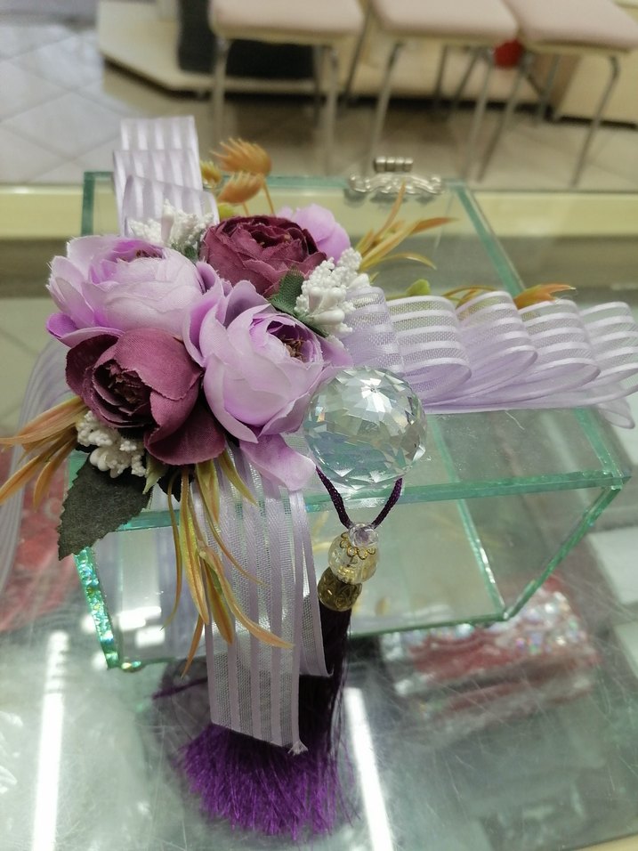 Bohem tarzda, açık mor çiçekler, püskül ve dekoratif kristal içeren klasik ve gösterişli gelin aksesuarı. 15*15*11cm