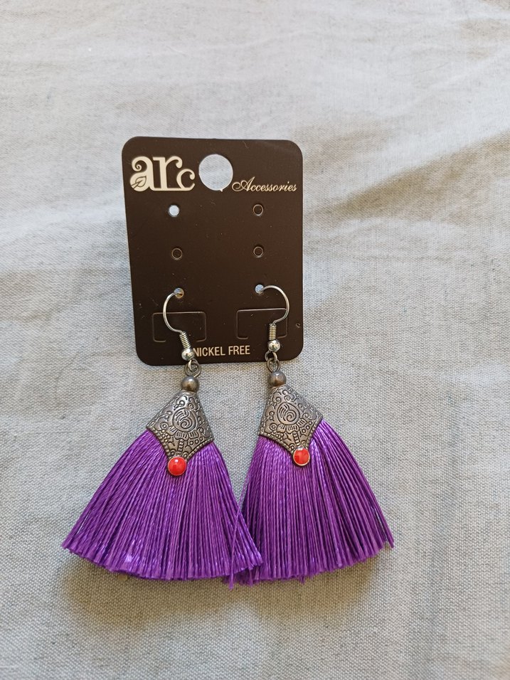 Mor püsküllü, etnik desenli, nikel içermeyen günlük kullanıma uygun bohem tarz küpe.Hic kullanmadım onun için satiyorum