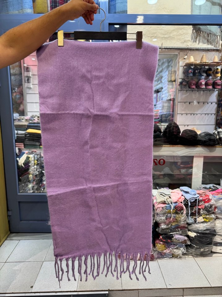 Yumuşak sentetik kumaştan yapılmış, püskül detaylı pastel mor kadın şalı, rahat ve bohem sokak stili için uygundur.