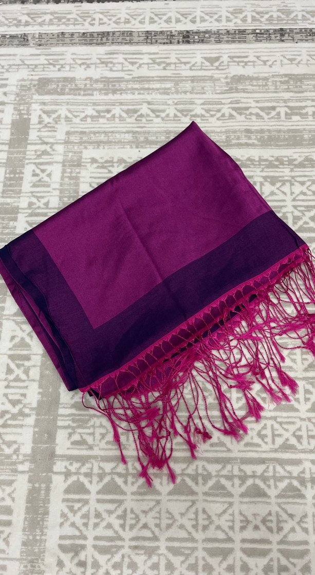 Kadınlar için koyu mor renkte, saten dokulu ve kenarlarında püskül detaylı bohem tarzı şal.