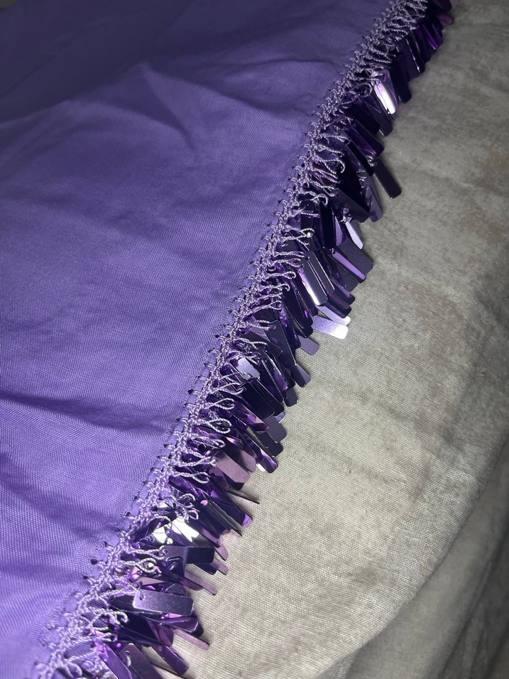 Mor renkli, sentetik kumaştan yapılmış ve püsküllerle süslenmiş kadın yazma , bohem ve göz alıcı bir tarz sunar. ✨