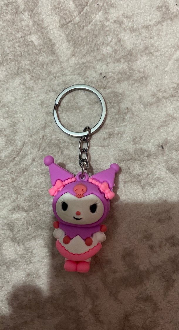 Renkli, mor pop kültür figürlü, püskül detaylı anahtarlık. Rahat ve rock punk havası taşıyor. ️