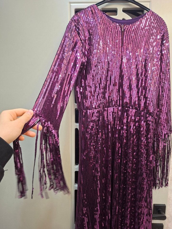 Bu uzun mor abiye elbise parlak pul payetler ve püsküllerle süslenmiştir. Vücuda oturan bohem tarzda, yuvarlak yakalıdır. ✨standart beden