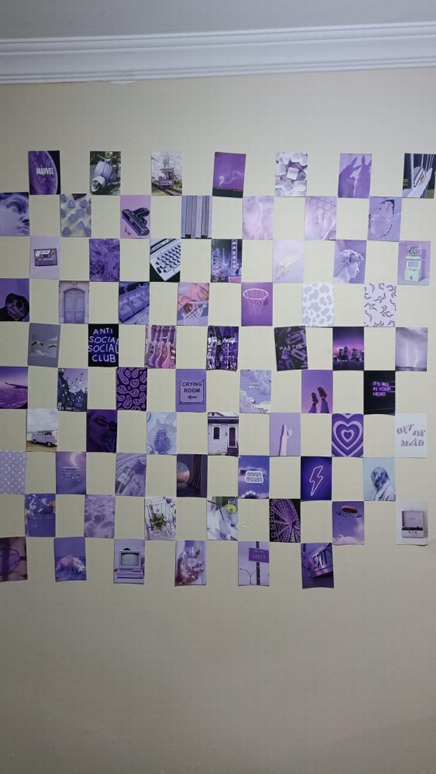 Açık mor renkte çeşitli görüntü ve desenlerle duvara yerleştirilmiş puzzle parçaları. Arkadındaki bantlar yüzünden izi var. Onun dışında sorun yok.