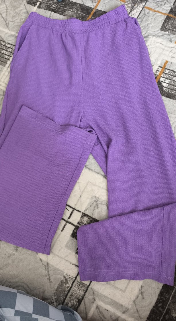 Mor renk, rahat kesim kadın kumaş pantolon. Yumuşak dokulu sentetik kumaştan, günlük kullanım için sade ve şık bir tasarım.