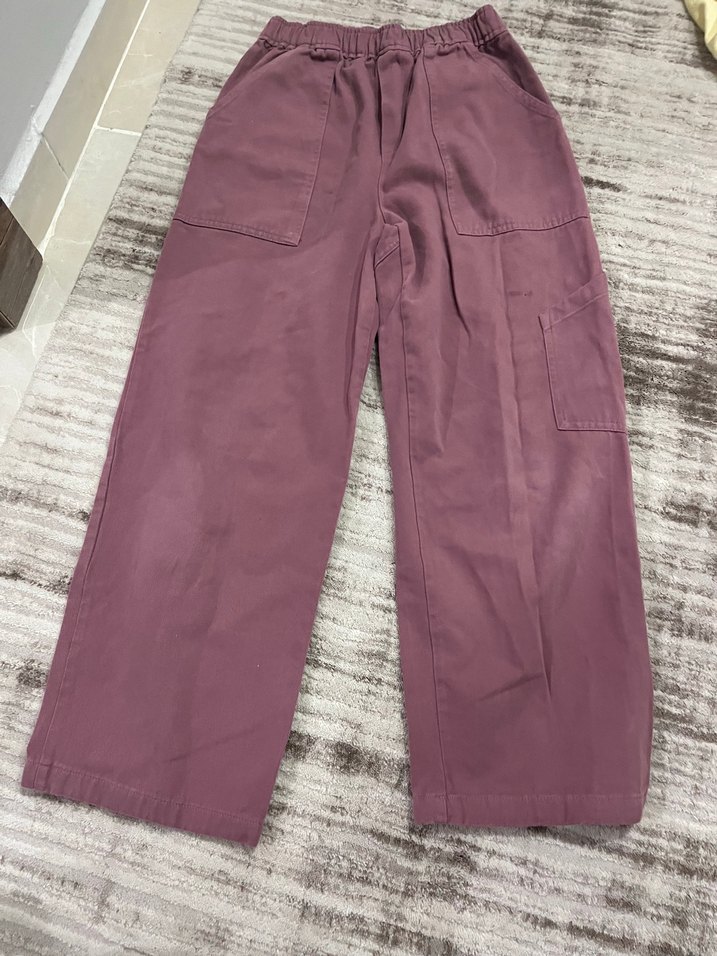 Pastel mor renkte, bol kesim, lastikli bel ve büyük ceplere sahip kadın kumaş pantolon, günlük rahat kullanım için şık ve konforlu.