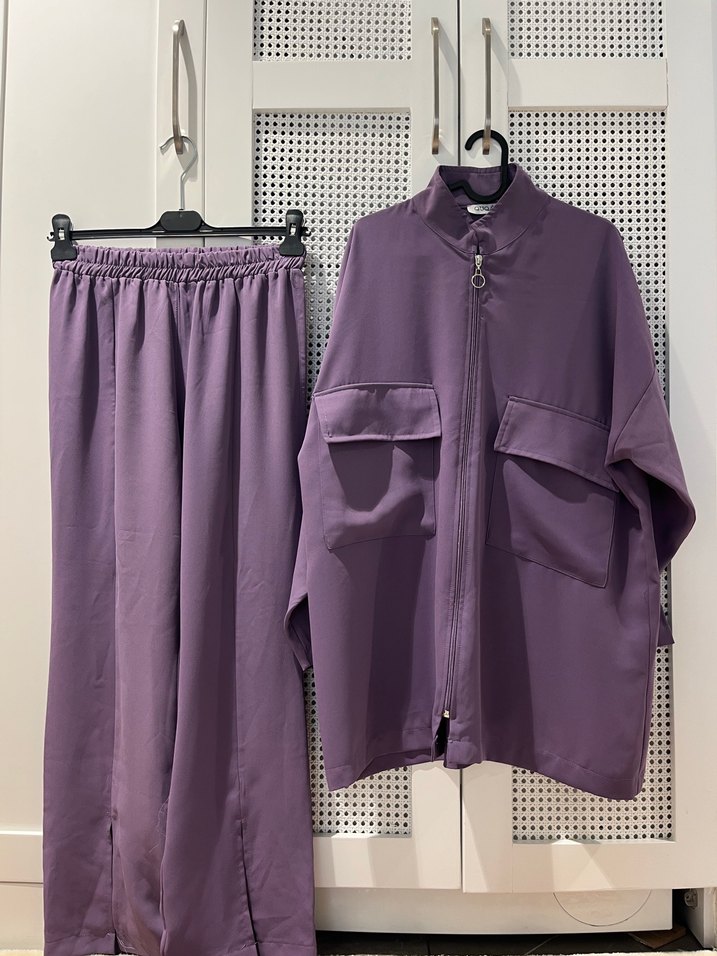 Mor renk, rahat kesim, uzun kollu ve midi boy kadın takım. Yumuşak sentetik kumaştan, yakası kesik detaylı, günlük kullanım için şık ve rahat. Hiç giyilmedi. 36-40 beden arası rahat olur