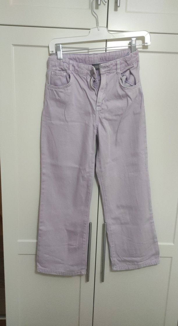 Mor pastel renkli, denim kumaştan yapılmış, rahat kesim kız pantolonu. Normcore tarzında, zahmetsiz şıklık sağlar.