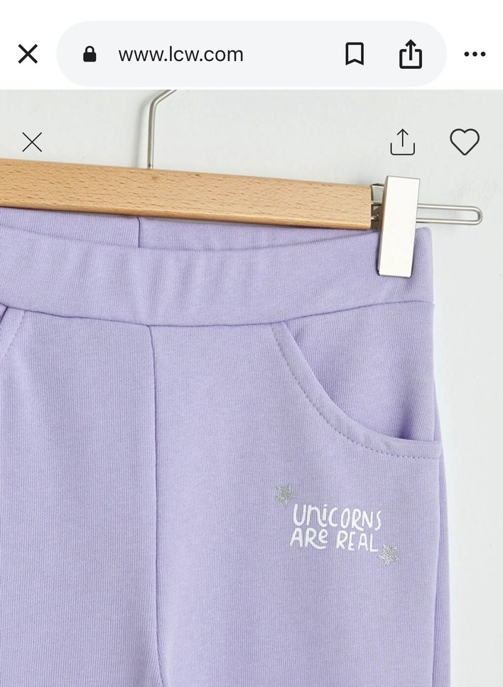 Mor rahat kesim kız taytları, yumuşak ve sıcak kumaşla dikkat çeker. Cepli ve 'Unicorns Are Real' yazılı, trend bir görünüm sunar.