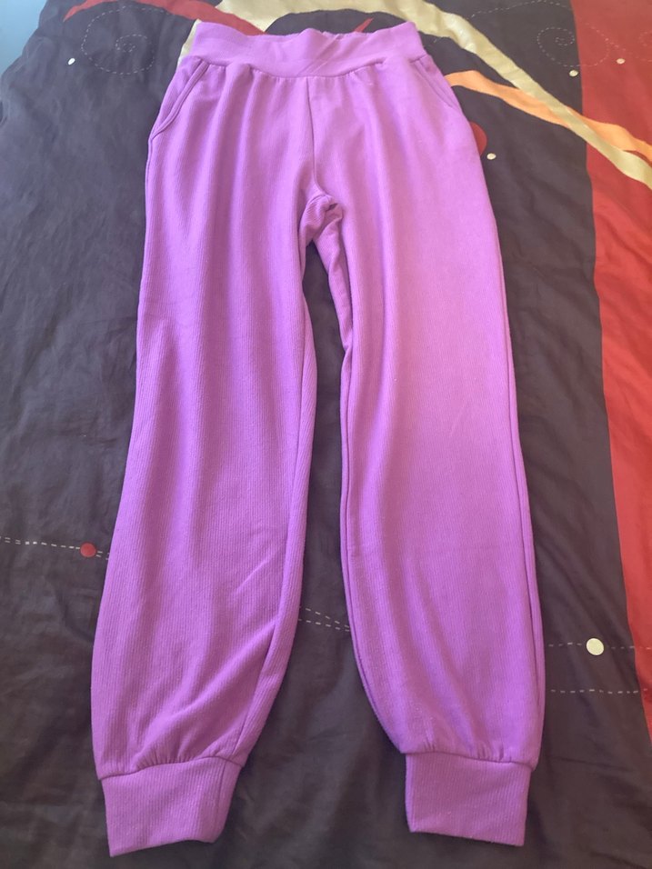 Mor renkli, rahat kesimli, normal midi boyunda, yumuşak ve sıcak kumaştan kadın eşofman altı. Spor ve gündelik şıklık için ideal. ♀️