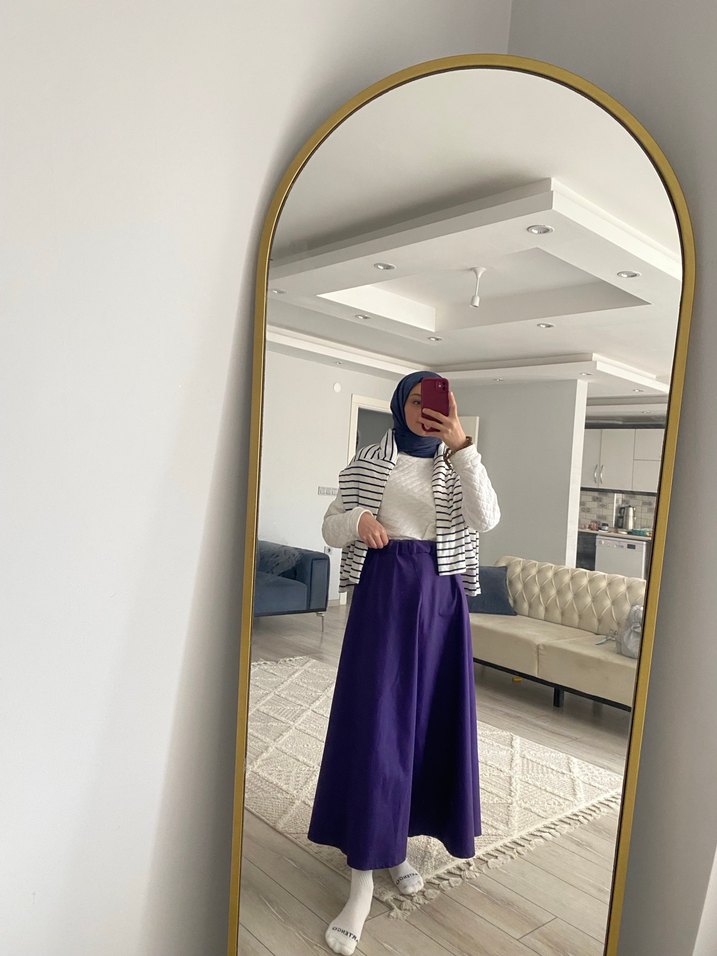 Mor renkte, pamuk kumaştan, rahat kesim ve drapeli uzun etek. Günlük kullanıma uygun, sade ve mütevazı tarzda.