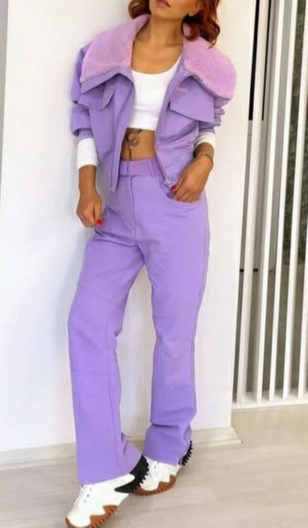 Mor renkte, regular fit kesime sahip, yakalı ve kollu kadın takım elbisesi. Yumuşak ve sıcak kumaştan yapılmış, günlük rahat şıklık sağlar.