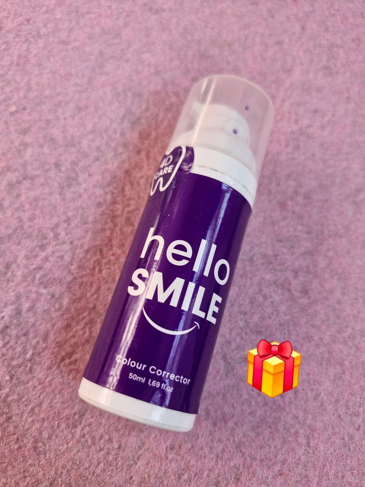 Mor renkte, üzerinde 'hello SMILE' yazan 50ml renk düzeltici diş macunu Canlı ve renkli tasarıma sahip. %65 dolu