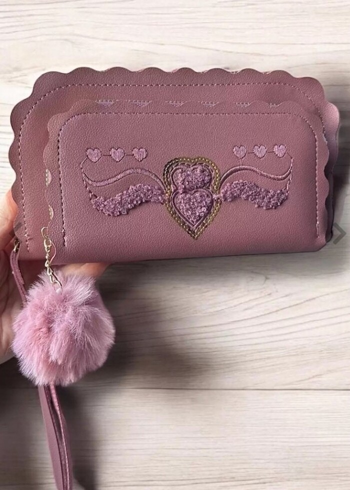 Mor renk kalp figürlü ponpon detaylı kadin deri cuzdan sıfır etiketli saticidan