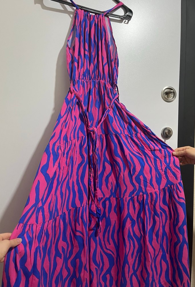 Beden/ S-M Uyumludur. Az kullanıldı. Canlı renkli, bağlamalı askılı, yüksek yakalı ve bol kesimli bohem tarz uzun elbise. Sentetik kumaştan, dış mekan kullanımı için uygundur.