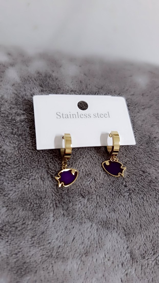 Parlak mor desenli kısa uzunlukta, tokalı paslanmaz çelik balık küpeler. Günlük ve sokak tarzı için uygundur.