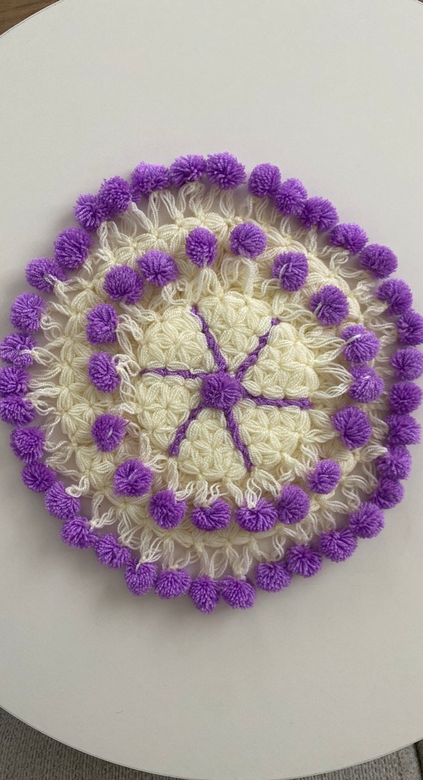 Mor ve krem tonlarında, ponpon süslemeli yuvarlak tığ işi renkli banyo süngeri.