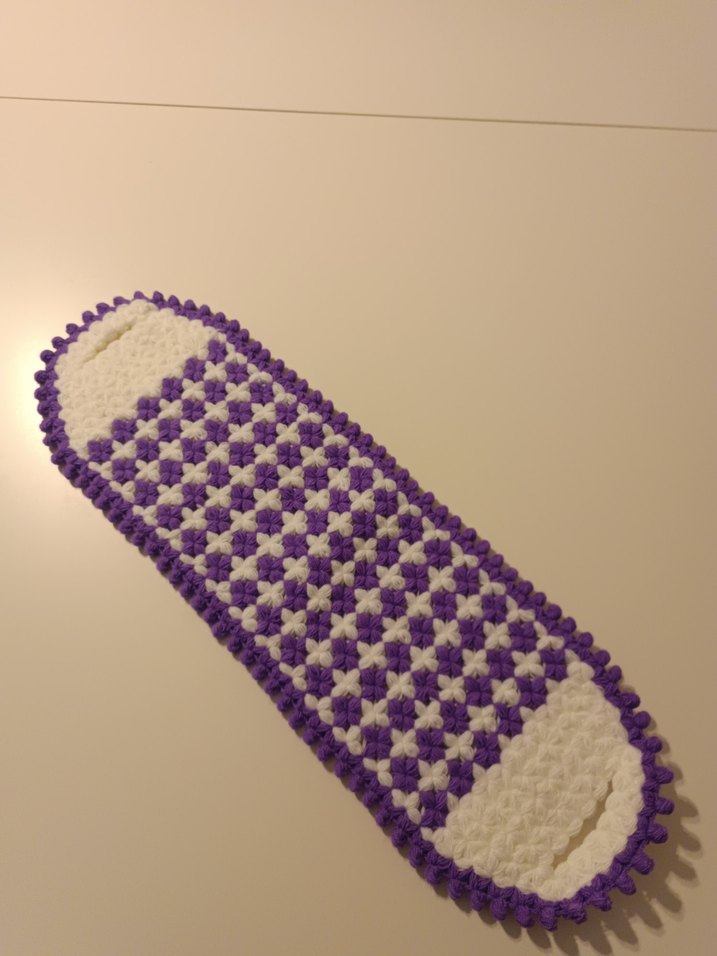 Mor ve beyaz renklerde örülmüş, nazik ve etkili bir temizlik sağlayan banyo süngeri.