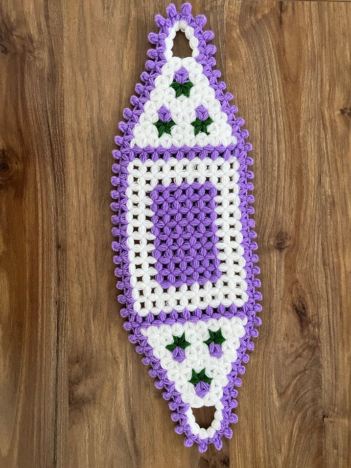 Mor ve beyaz renklerde, yeşil detaylı renkli örgü tasarıma sahip banyo süngeri. Nazik temizlik için dokulu yüzeyi bulunur.