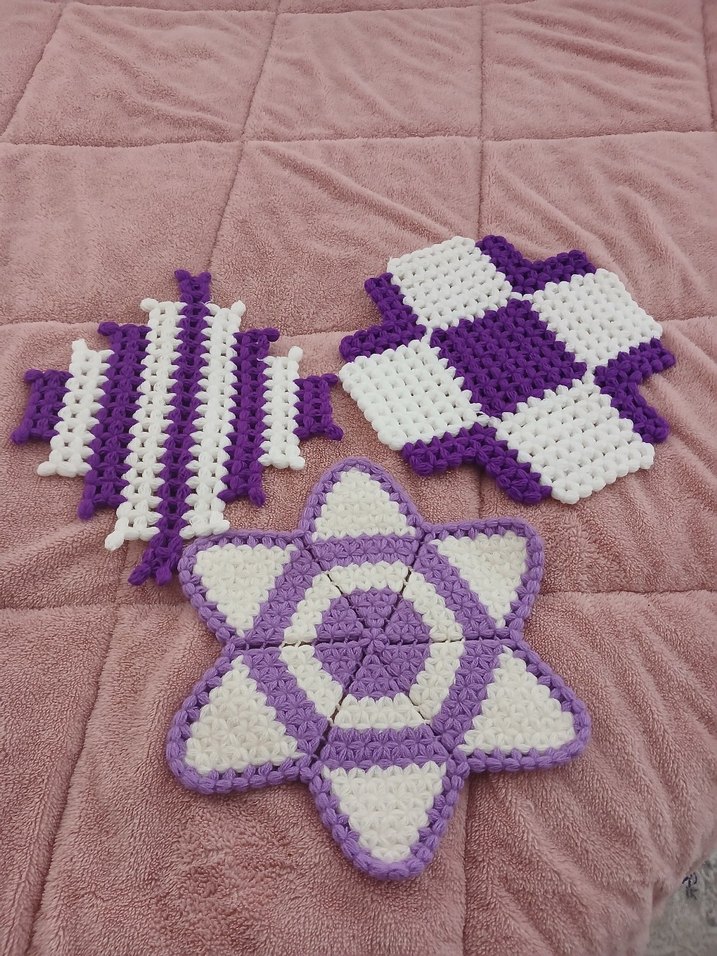 Mor ve beyaz renklerde, çeşitli geometrik şekillerde, etkili temizlik ve nazik peeling için tasarlanmış renkli banyo süngerleri.