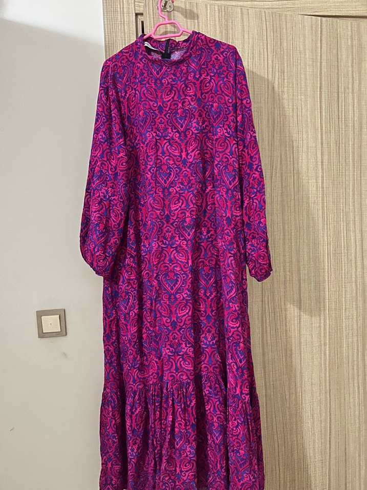 Renkli batik desenli, bol kesim, uzun kollu, yüksek yakalı, sentetik kumaştan yapılmış mor bohem uzun elbise, fırfır detaylı.