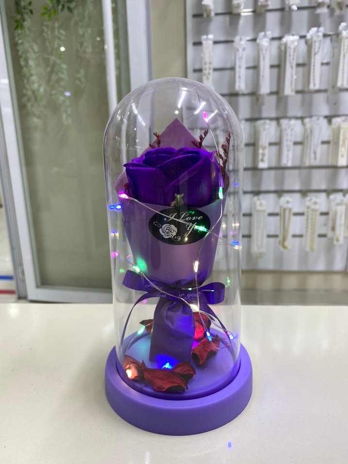 Mor renkli koruma altındaki gül, cam fanus içinde renkli LED ışıklarla süslenmiş, tabanda uyumlu mor renk ve dekoratif yapraklar bulunuyor.