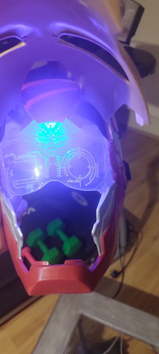 Mor renkte canlı aksiyon figürü, ışıklı detaylar ve karmaşık kalıplı tasarıma sahip. Dinamik bir görünüm için ışık efekti içerir. Mor Renkli Canlı Aksiyon Figürü # demir adam maske