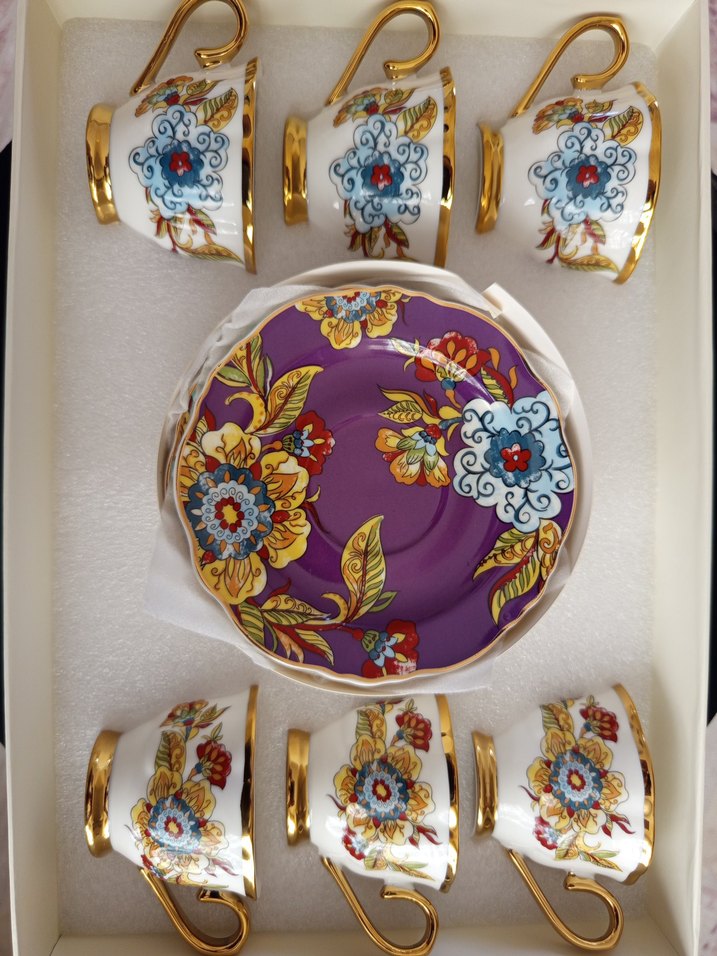 Altı adet kulplu kahve fincanı ve mor renkli, çiçek desenli tabaktan oluşan set. Canlı renkler ve ayrıntılı tasarımla şık bir görünüm sunar. ☕