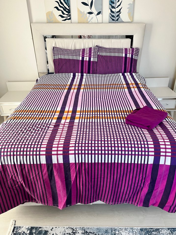 Mor renkli çizgili desenlere sahip renkli nevresim takımı, uyumlu yastık kılıfları ve çarşaf içerir. ️ev hedıyesı gelmıstı temızdır 2 kere kullanıldı