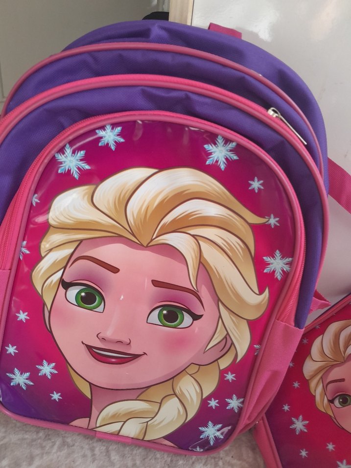 Mor renkli çocuk okul çantası, renkli karakter baskısı ve kar tanesi desenleri içerir. Fermuarlı çoklu bölmeleri vardır.