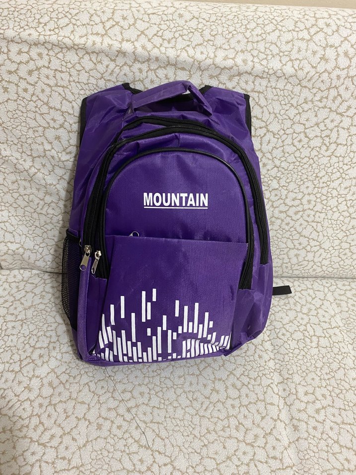 Renkli mor çocuk okul çantası, çoklu fermuarlı bölmeler ve ön cepten "MOUNTAIN" yazısı içerir. Sıfır hiç kullanılmadı küçük bir deformesi var son resimde mevcut