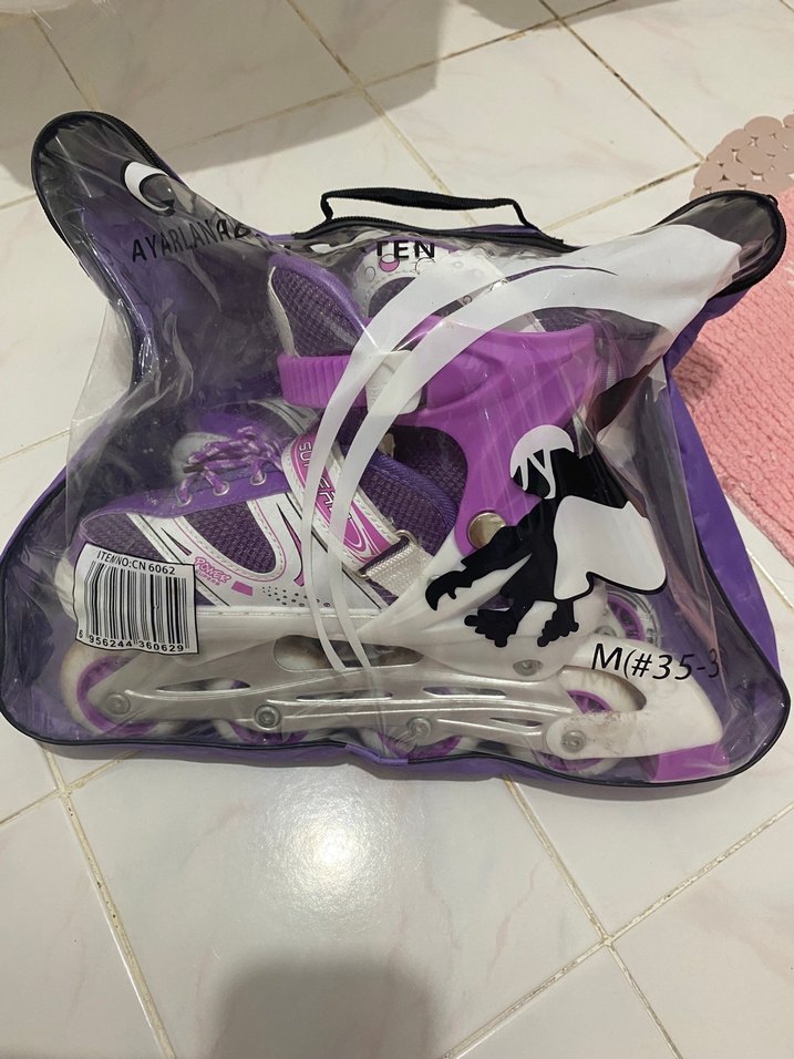 Ayarlanabilir bantlı, M#35 numara, mor renk çocuk paten seti, şeffaf çantada. 35-38 numara defo yok iki kere bindi kuzenim