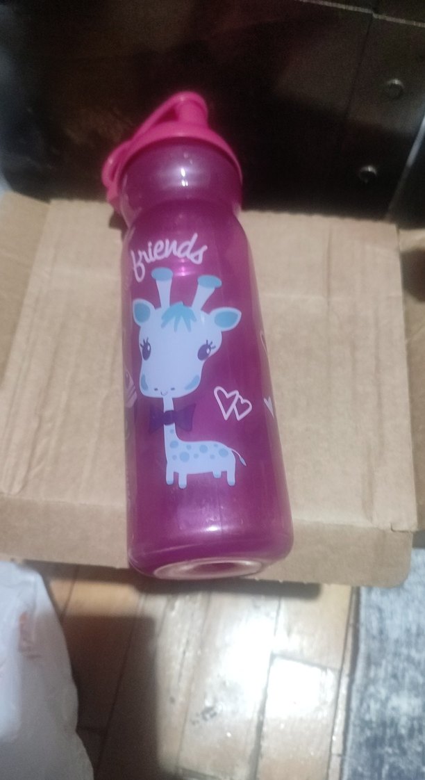 Mor renkli çocuk suluk, zürafa çizimi ve taşıması kolay kapakla tasarlanmıştır. Üzerinde 'prends' yazısı bulunur.