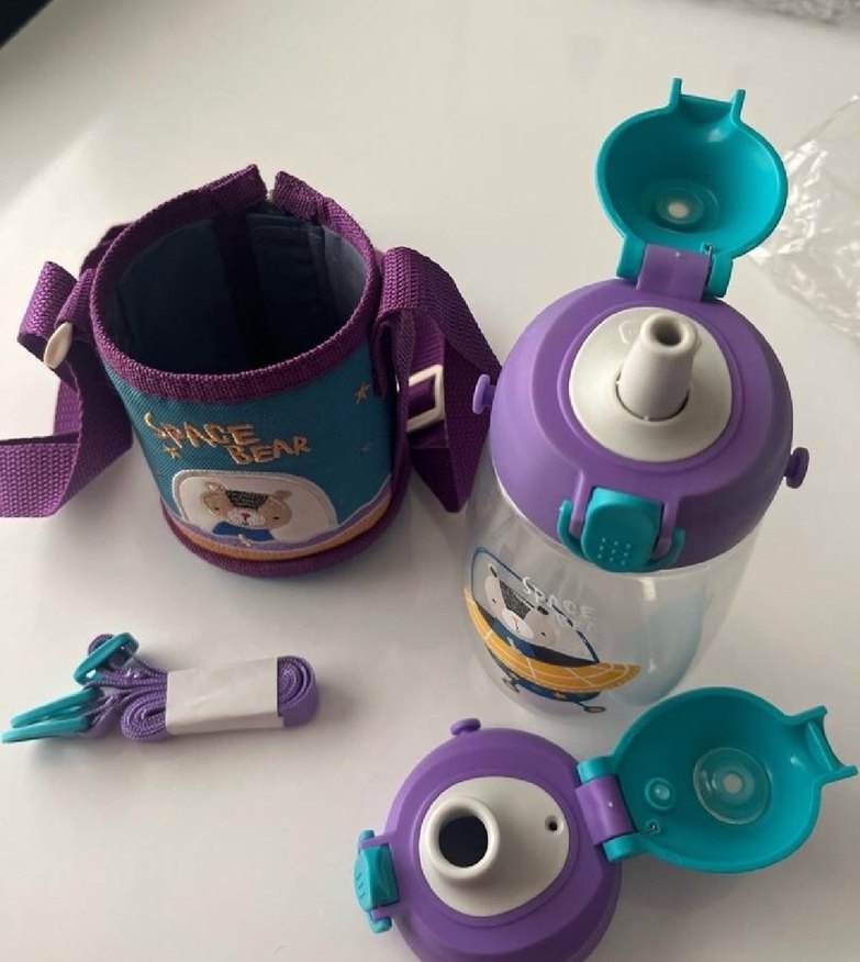 Mor renkli çocuk termos şişesi, güvenli açılır kapak ve sevimli ayı desenli yalıtımlı kılıf ile birlikte gelir. Orijinal Fiyatını Ekledim