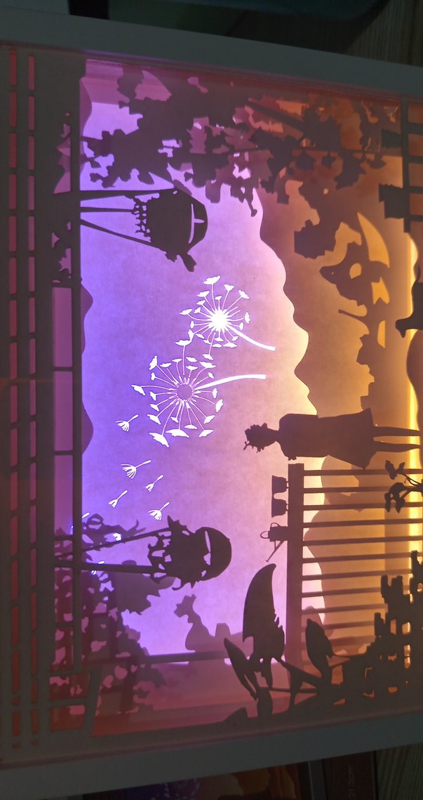 Mor renkli dekoratif LED'li tablo, karahindiba ve insan figürlü silüetle sıcak ve sanatsal bir atmosfer yaratır.