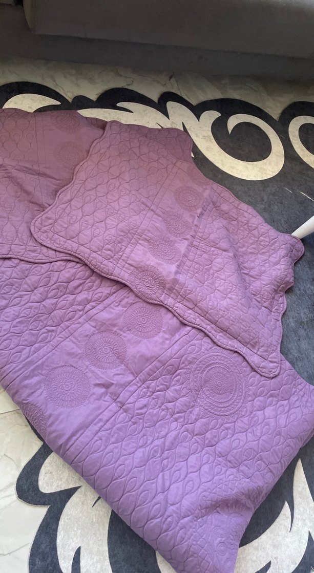 Mor renkli, kabartmalı desenlere sahip yumuşak ve rahat dokulu yatak örtüsü. Gri ortamlarla uyum sağlar. ️