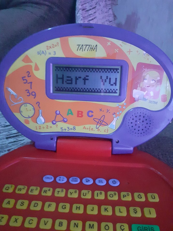 Mor renkli, dijital ekranlı eğitici oyuncak dizüstü. Harf ve basit matematik sembolleri içerir, öğrenmeye yardımcıdır.