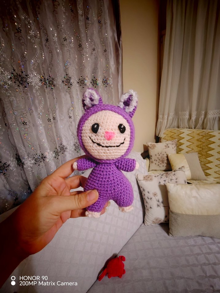 Mor renkte, el örgüsü ve gülen yüzlü, küçük kulaklı renkli peluş oyuncak. Adet fiyatı dır elimde olan ürünler için geçerlidir