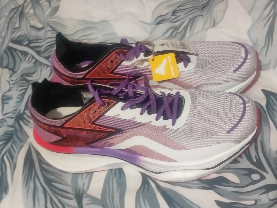 Mor renkli, baskılı desenli erkek spor ayakkabısı. Velcro detaylı, kauçuk tabanlı ve stiletto topuklu, sokak tarzına uygun.