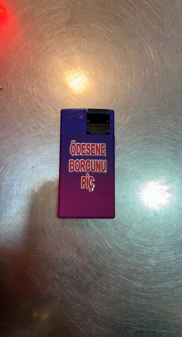 Üzerinde esprili "Ödesene borcunu piç" yazan mor renkli renkli çakmak.