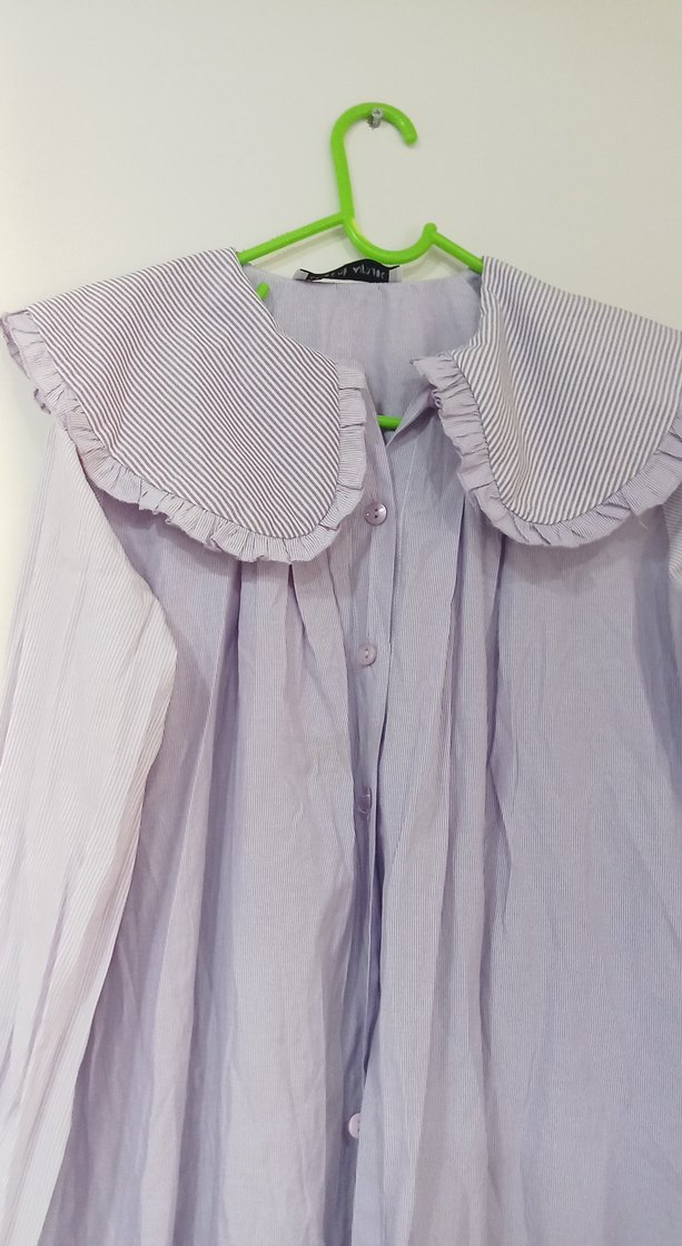 Mor renkli keten gömlek, uzun kollu ve yakasında fırfır detayları bulunur. Trendy günlük stil için uygun.