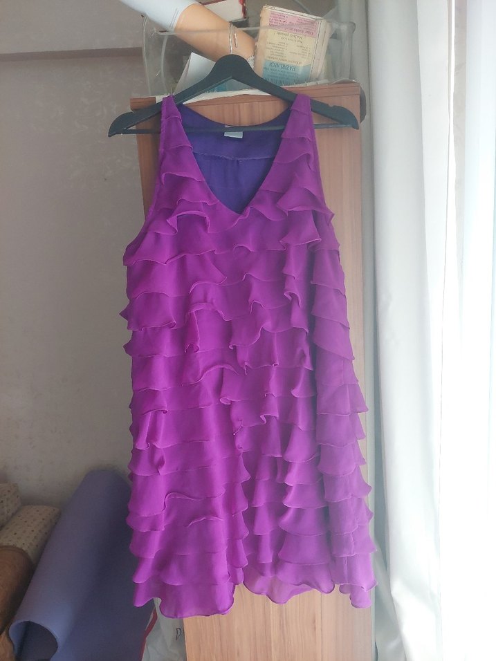 Parlak mor renkte, V yakalı ve kolsuz, bol kesim midi abiye elbise. Fırfır detaylarıyla avant-garde tarzı yansıtır.